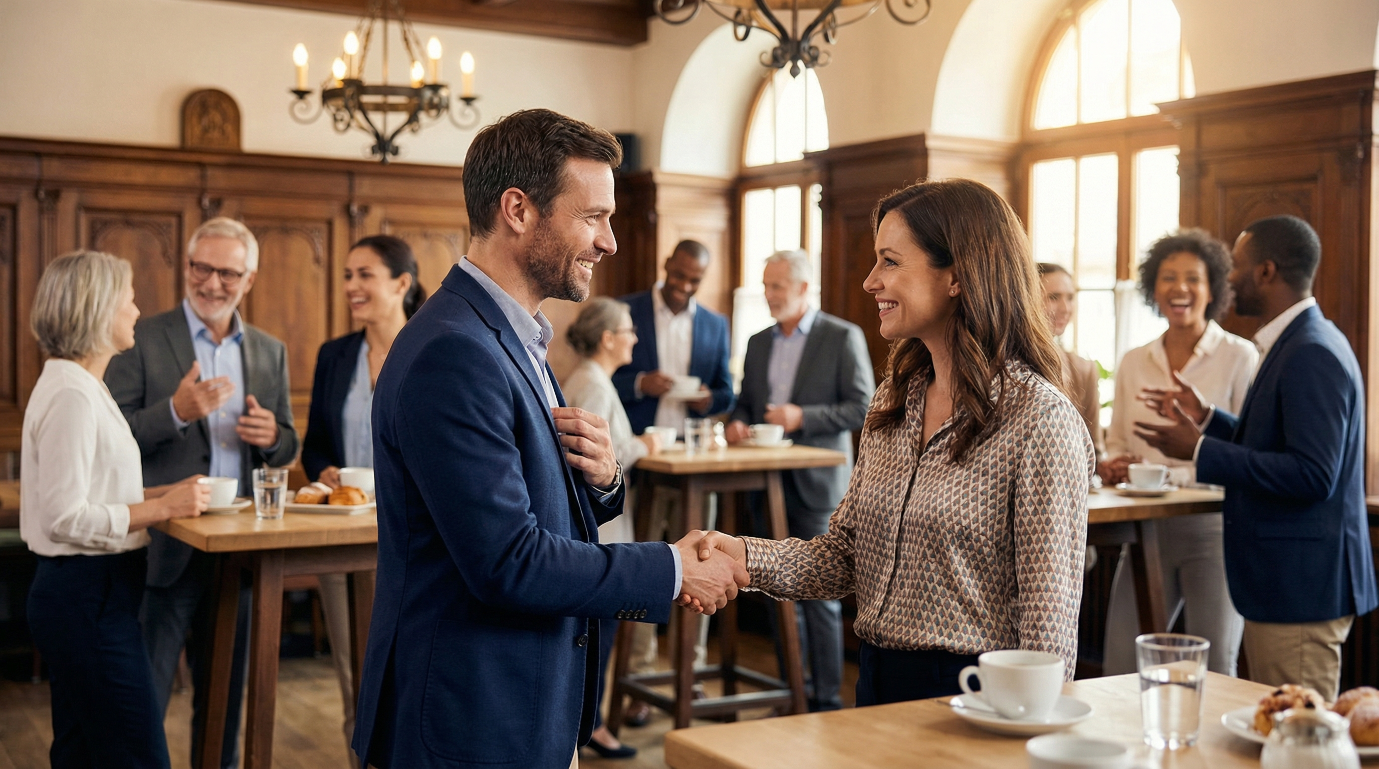 Keine Kaltakquise, keine leeren Visitenkarten. Hier entstehen echte Geschäftsbeziehungen durch persönliche Empfehlungen aus der Nachbarschaft.